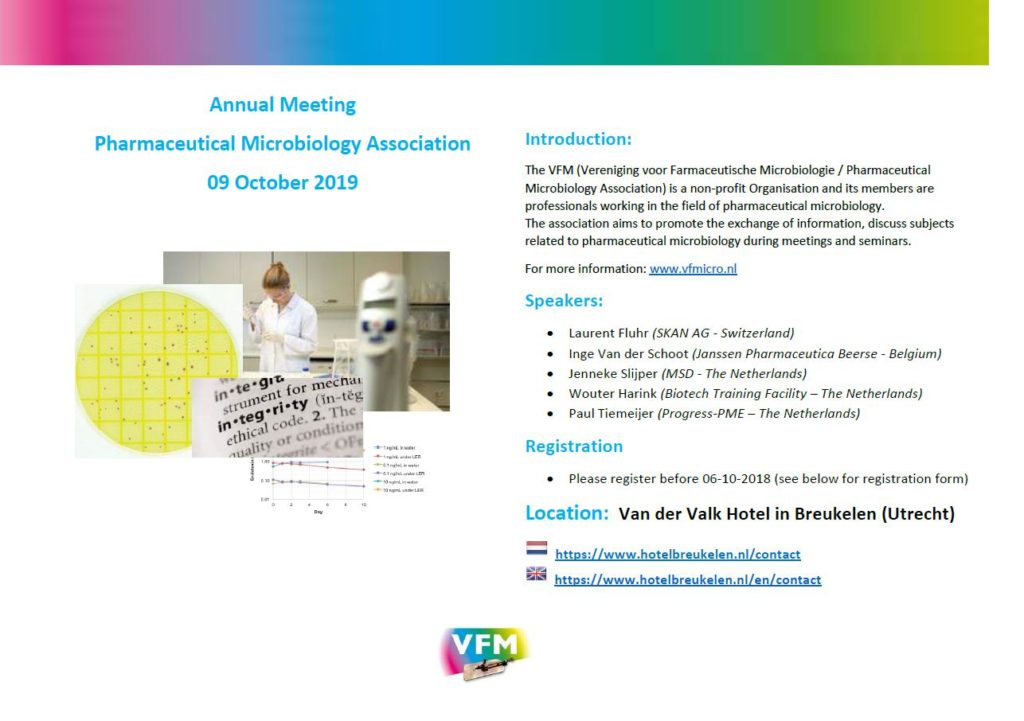 The VFM ( Vereniging voor Farmaceutische Microbiologie / Pharmaceutical Microbiology Association) is a non-profit Organisation and its members are professionals working in the field of pharmaceutical microbiology.